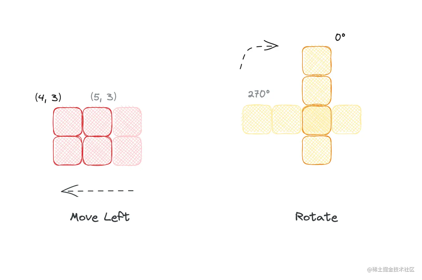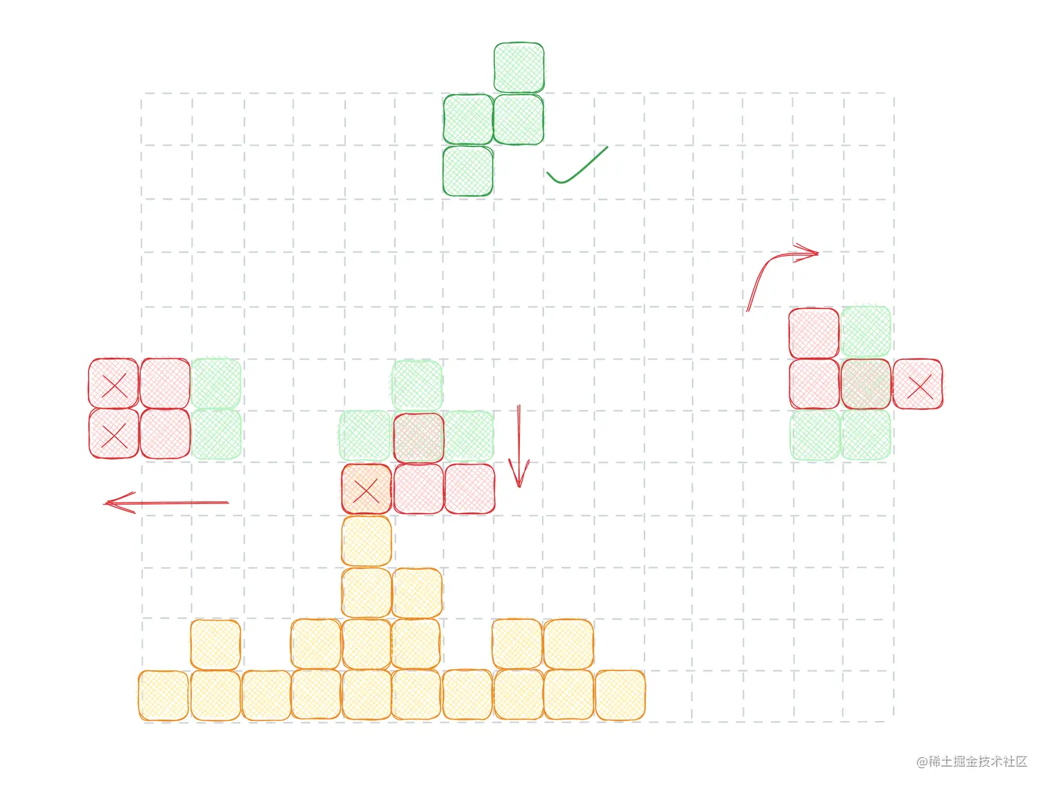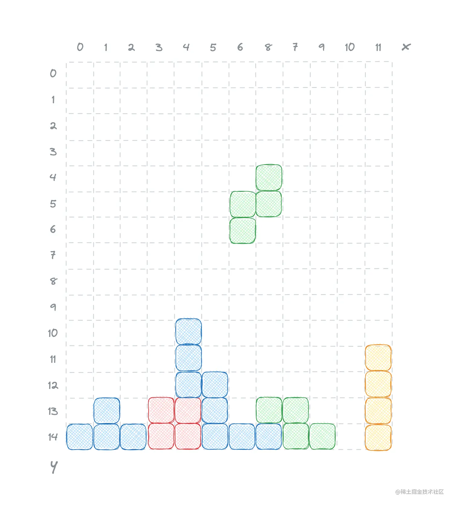 例如下图中,红色形状左上角方块在棋盘中的坐标为 (3, 13)。通过数组下标取值的方法为 playground[13, 3]。当然,你也可以按照你喜欢的方式定义 playground,只要和渲染层约定一致都是可以的。