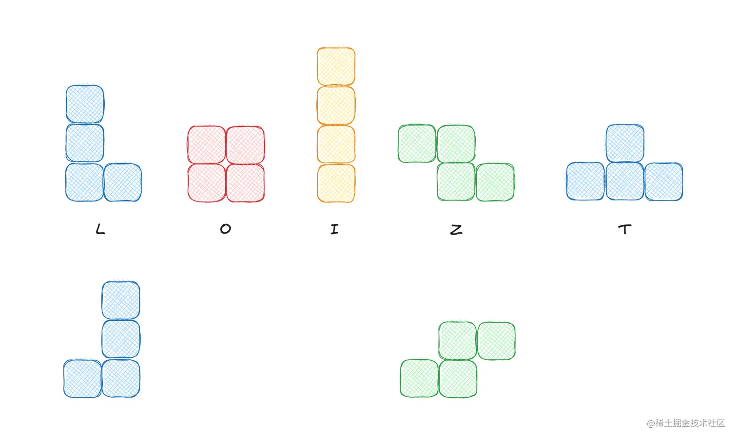 俄罗斯方块的基本形状有 7 个,分别是 L、O、I、Z、T 及其镜像(L、Z 有镜像,其余形状镜像为自身)。基本形状在棋盘上运动时可以左右移动和旋转。我们只要用数据表示出这些形状,这一步就完成了。