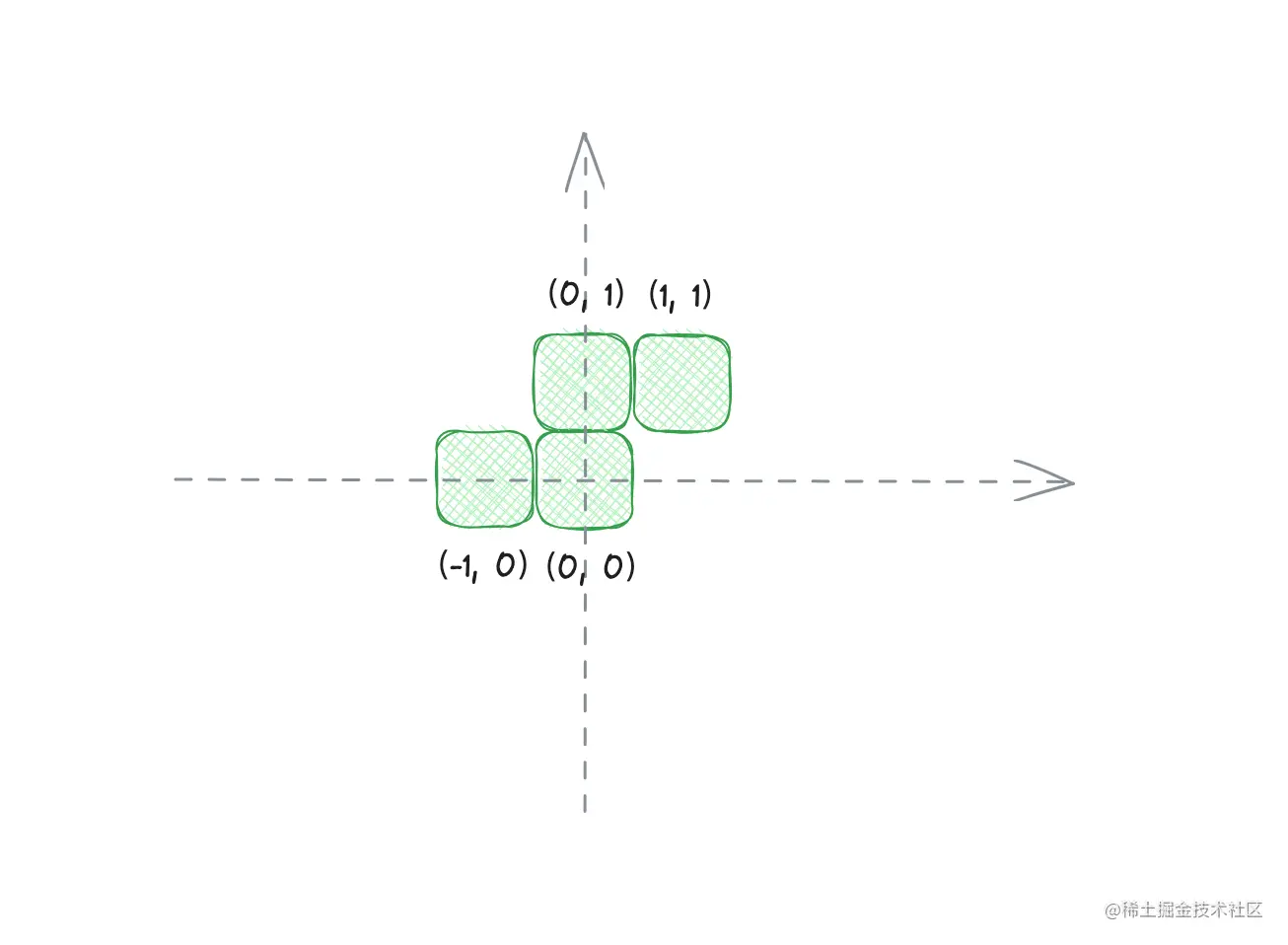 不难看出,每个形状都由四个小方块组成,而小方块的相对位置决定了形状。我们自然会想到用一个二维坐标来表示一个小方块。就像这样: