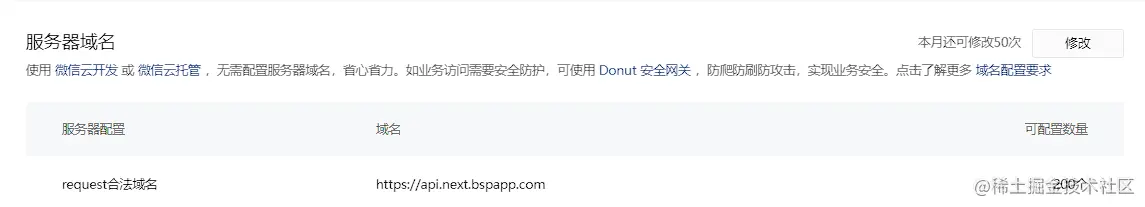 在微信MP后台中开发-开发管理-开发设置-服务器域名-request合法域名中添加EMAS serverless域名: