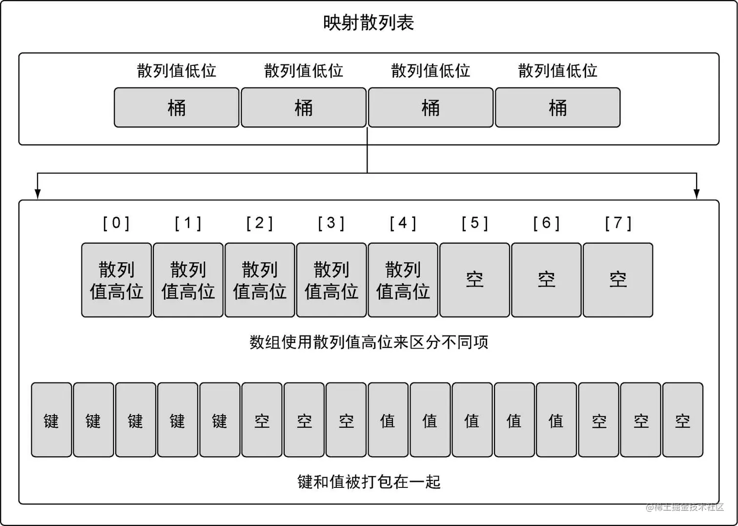 如果再仔细看看图4-24,就能看出桶的内部实现。映射使用两个数据结构来存储数据。第一个数据结构是一个数组,内部存储的是用于选择桶的散列键的高八位值。这个数组用于区分每个键值对要存在哪个桶里。第二个数据结构是一个字节数组,用于存储键值对。该字节数组先依次存储了这个桶里所有的键,之后依次存储了这个桶里所有的值。实现这种键值对的存储方式目的在于减少每个桶所需的内存。