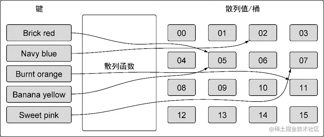 映射的散列表包含一组桶。在存储、删除或者查找键值对的时候,所有操作都要先选择一个桶。把操作映射时指定的键传给映射的散列函数,就能选中对应的桶。这个散列函数的目的是生成一个索引,这个索引最终将键值对分布到所有可用的桶里。