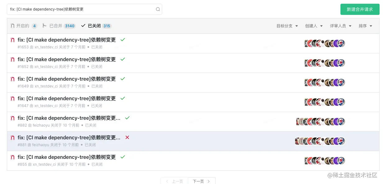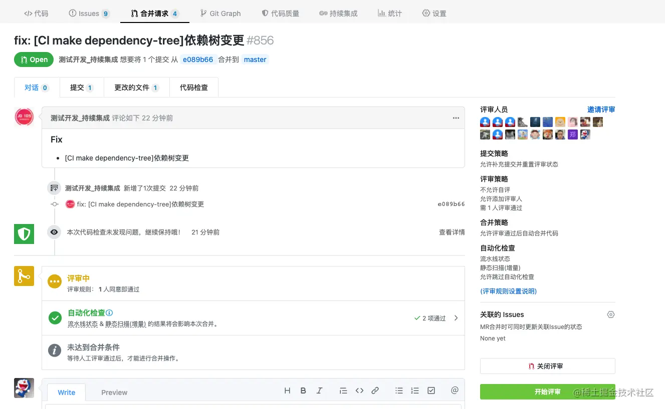可以查看到bamboo账号「测试开发_持续集成」发起的mr,评审即可(只改动依赖树文件)