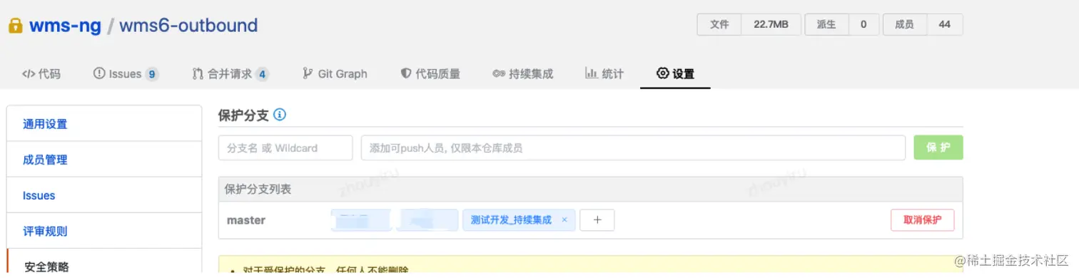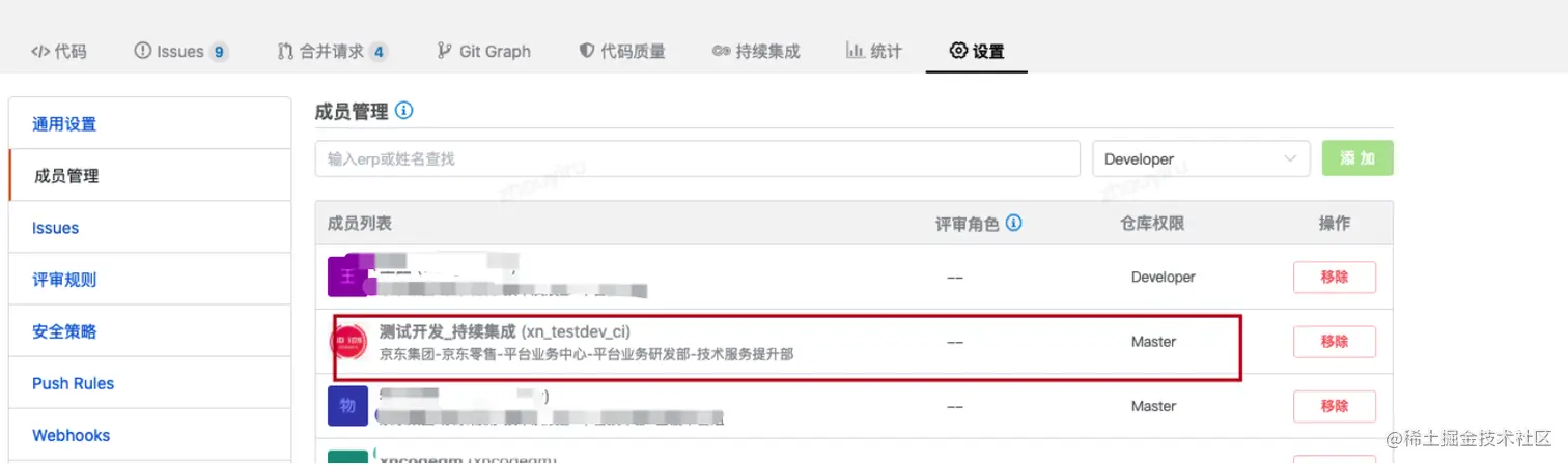 增加xn_testdev_ci账号 master权限,同时增加到保护分支列表权限中
