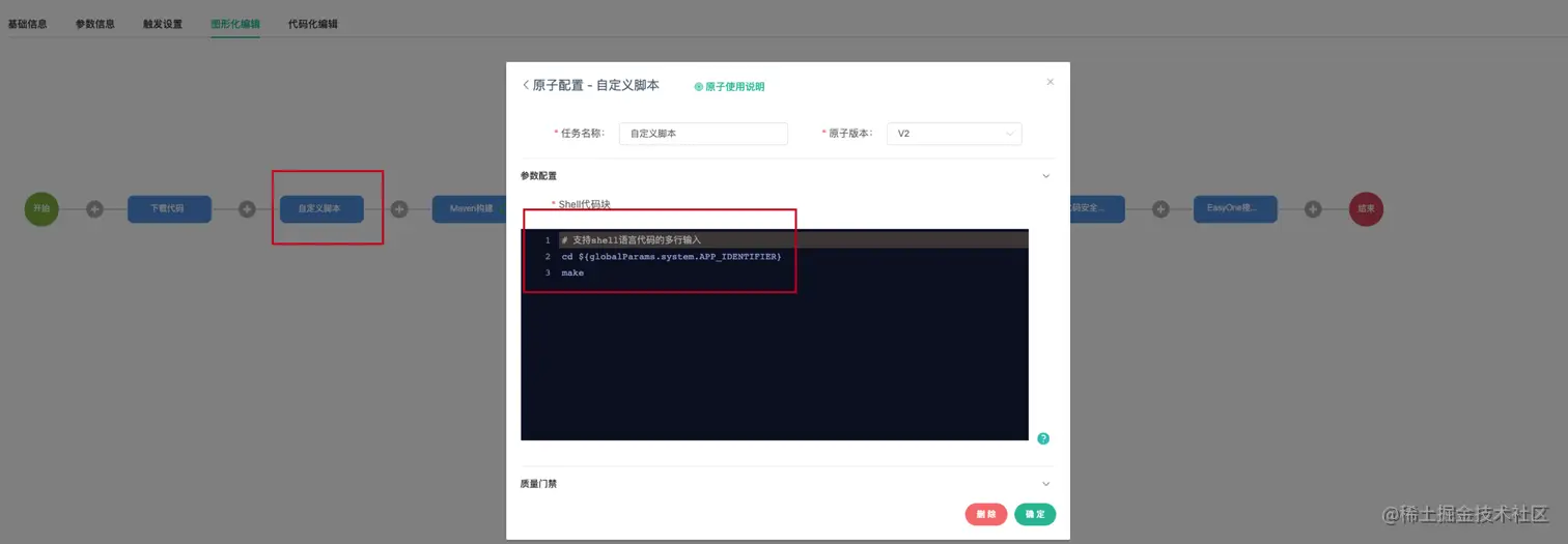在「下载代码」原子和「Maven构建」原子中间增加原子:「自定义脚本」(必须此顺序)
