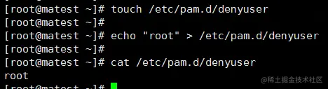 在/etc/pam.d目录下创建denyuser文件,并写入root;