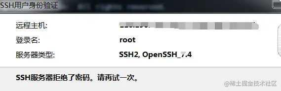 之后测试下使用root账户ssh登录云主机,提示密码被拒绝;