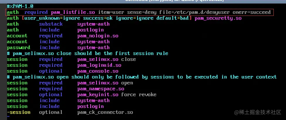 此行表示用户通过管理终端登陆主机的时候,会调用pam_listfile.so模块来验证用户是否可以登录;pam_listfile.so中配置的item=user表示基于用户;sense=deny表示拒绝;file=/etc/pam.d/denyuser则是定义了一个denyuser的文件;此行的含义是denyuser文件中的用户拒绝通过ssh系统;