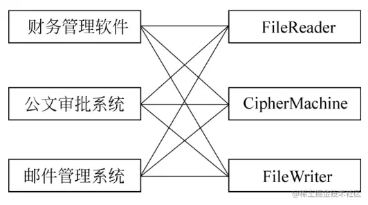 需求:开发一个文件加密软件,可以应用在不同的系统上。整个加密过程可以拆分成三个业务:读取源文件、加密、将加密后的文件保存。这三个业务操作相对独立,故把他们封装到三个独立的类中