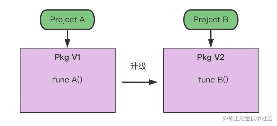 同一个pkg,有2个版本,A->A(),B->B(),而src下只能有一个版本存在,那AB项目无法保证都能编译通过。也就是在gopath管理模式下,如果多个项目依赖同一个库,则依赖该库是同一份代码,所以不同项目不能依赖同一个库的不同版本,这很显然不能满足我们的项目依赖需求。