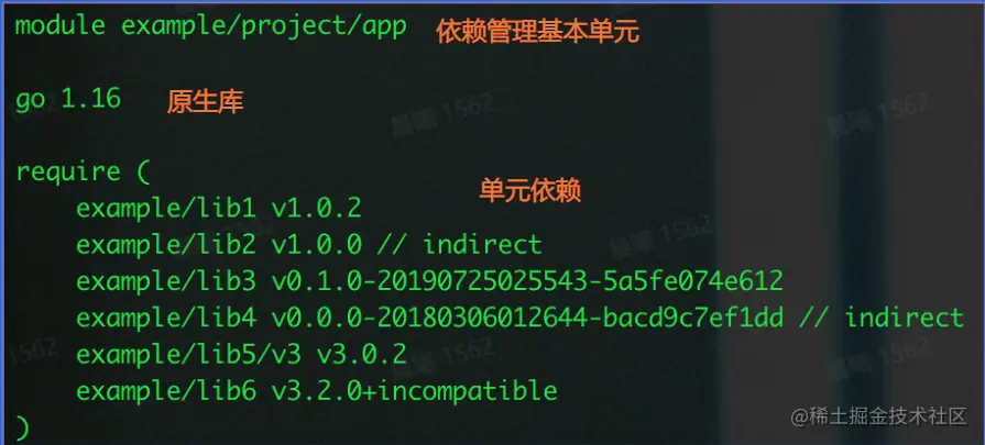 下面我们再来看下依赖单元中的特殊标识符,首先是indirect后缀,表示go.mod对应的当前模块,没有直接导入该依赖模块的包,也就是非直接依赖,标示间接依赖,例如