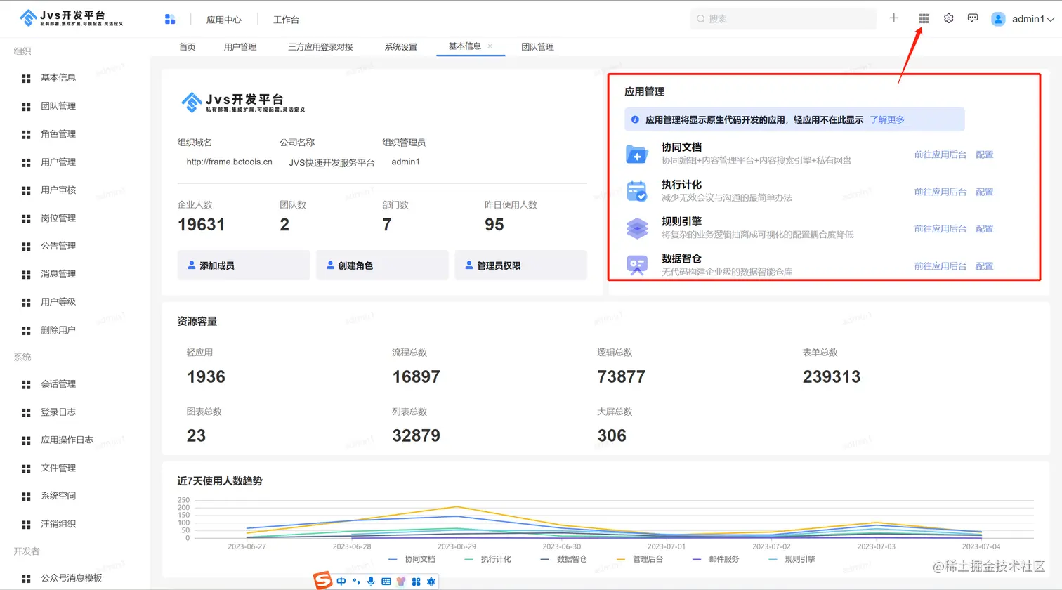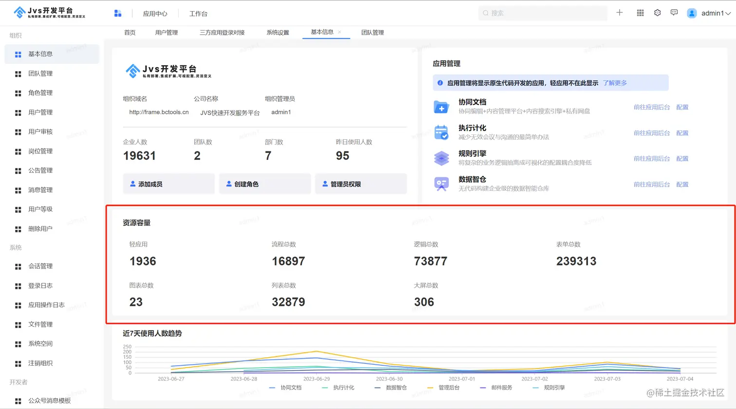 资源容量展现了低代码、BI分析的配置化页面与功能的配置使用的统计量,以及近7天的使用量