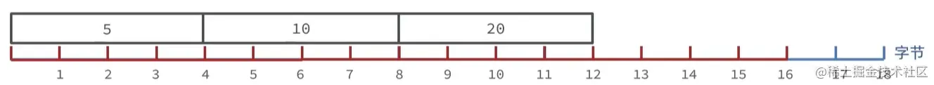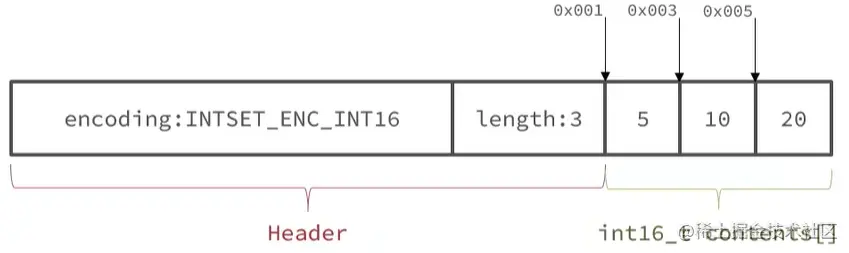 现在,数组中每个数字都在 int16_t 的范围内,因此采用的编码方式是 INTSET_ENC_INT16,每部分占用的字节大小为: