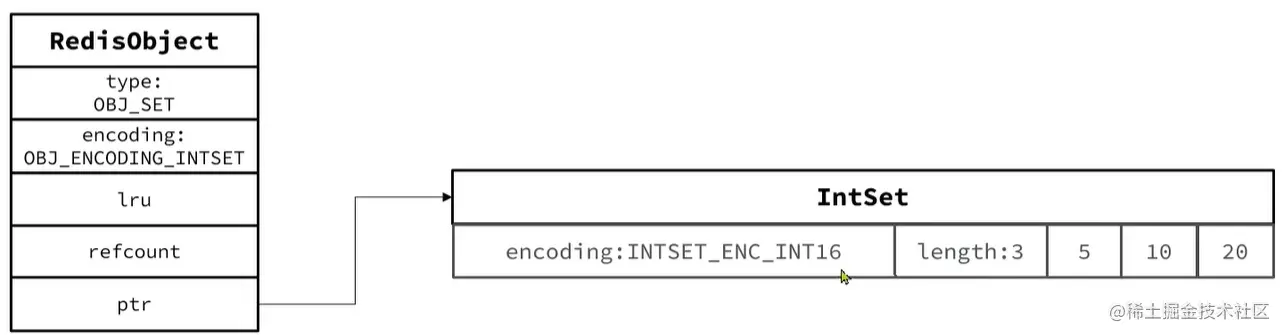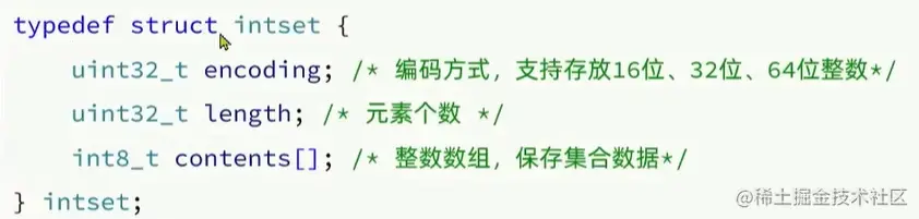 为了方便查找,Redis 会将 intset 中所有的整数按照升序依次保存在 contents 数组中,结构如图: