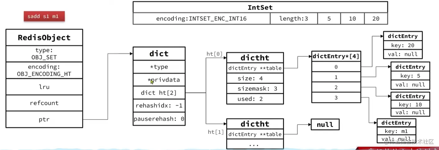 - 为了查询效率和唯一性,set 采用 HT 编码(Dict)。Dict 中的 key 用来存储元素,value 统一为 null。