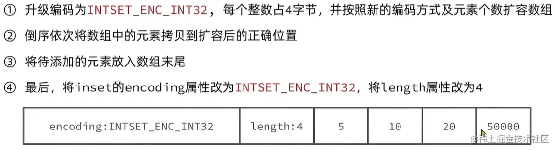 我们向该其中添加一个数字:50000,这个数字超出了 int16_t 的范围,intset 会自动升级编码方式到合适的大小。以当前案例来说流程如下: