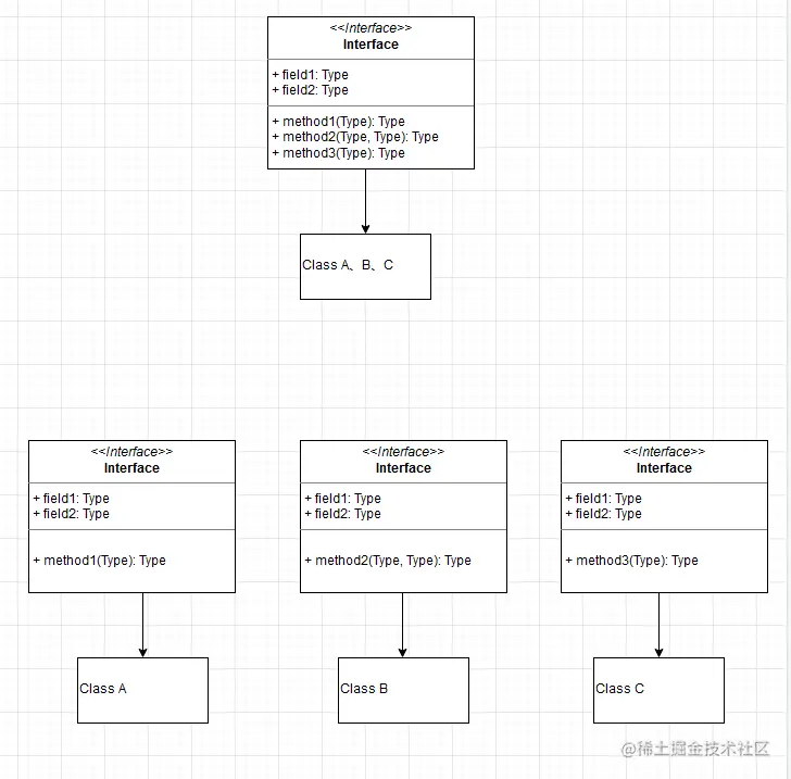 - 通俗来讲:建立单一接口,不要建立庞大臃肿的接口,尽量细化接口,接口中的方法尽量少。也就是说,我们要为各个类建立专用的接口,而不要试图去建立一个很庞大的接口供所有依赖它的类去调用。