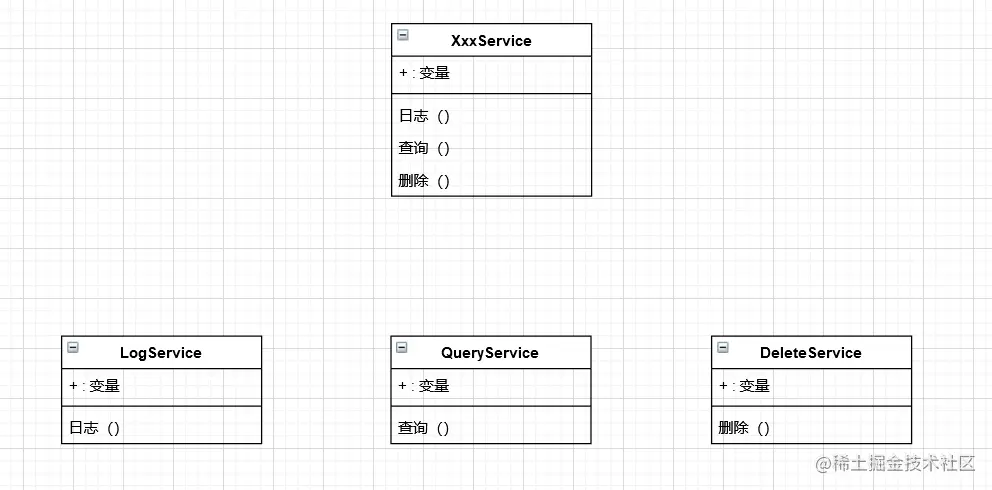 - 例子描述:功能性函数全都放到一个Service类里面,违反了单一职责原则。