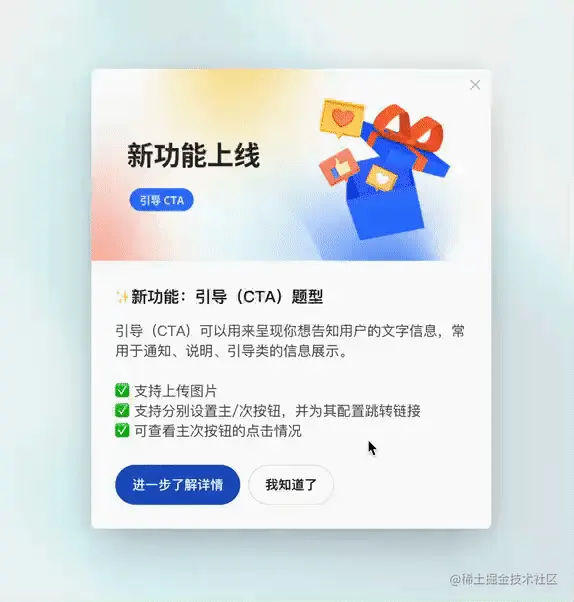 Tips:从用户能理解的业务价值侧,来吸引用户开启新功能的使用,注意,要记得设置投放策略哦,不要造成过度打扰。