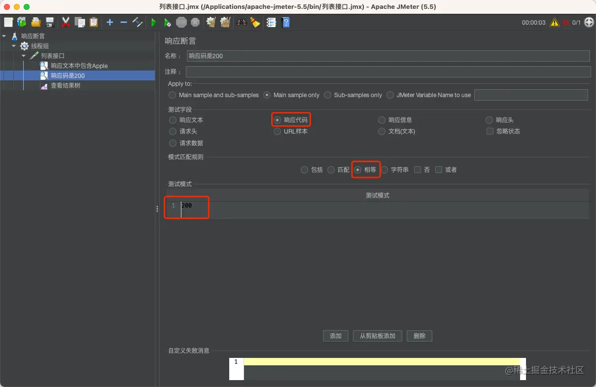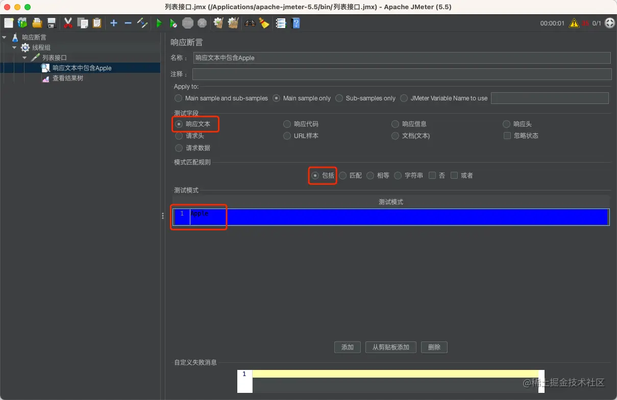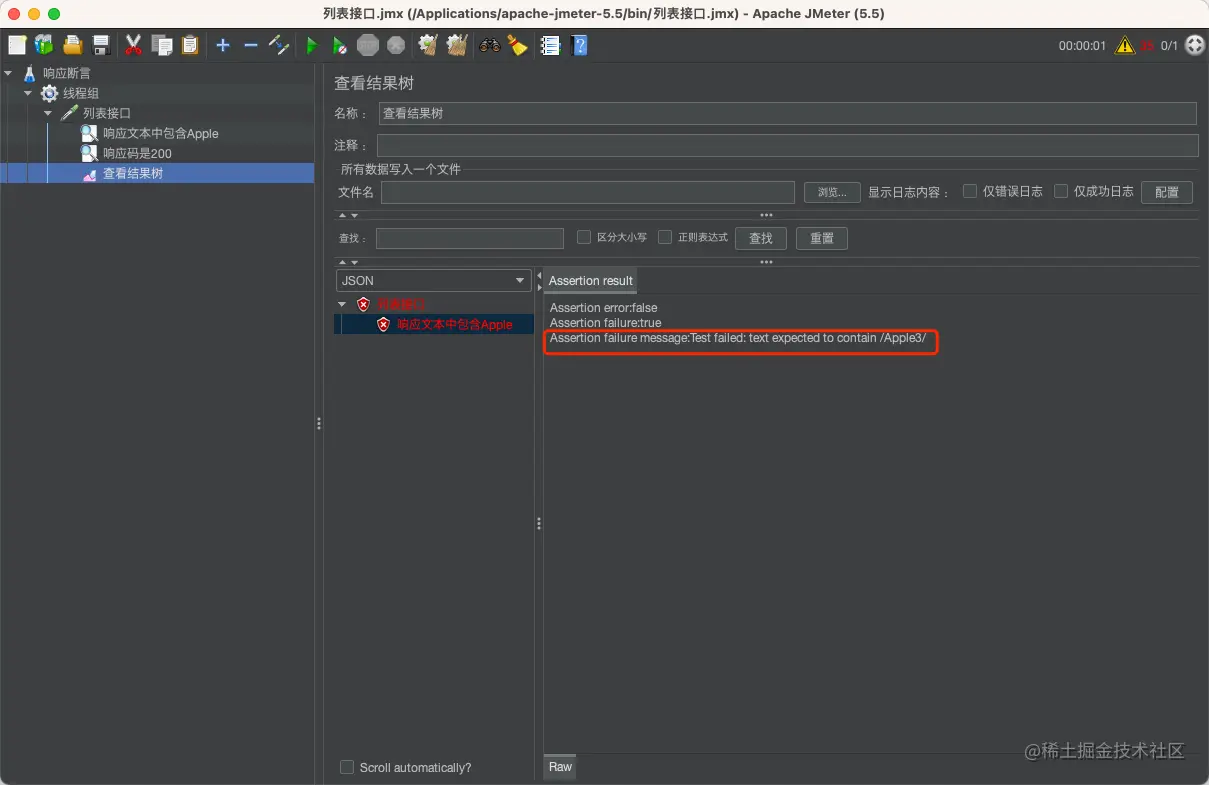 运行用例。如果响应符合断言,则什么都不会发生。否则,在结果树中会看到报错信息。将 响应文本中包含Apple 的断言值改成 Apple3,运行,就会看到如下的报错: