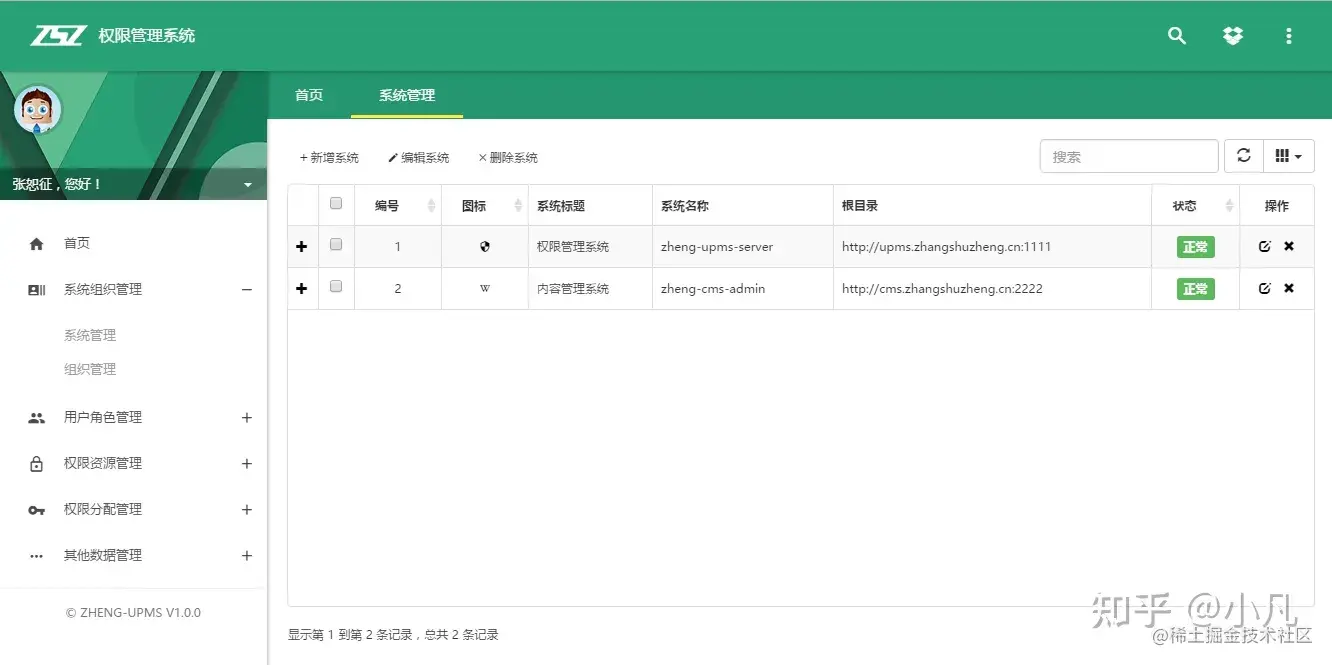 - 访问 upms.zhangshuzheng.cn:1111/,子系统菜单已经配置到zheng-upms权限中,不用直接访问子系统,默认帐号密码:admin/123456