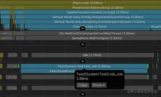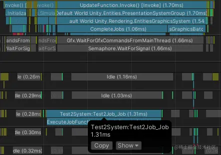 - Test1Job的主要消耗是JobHandle.Complete,也就是在等待本帧的工作线程结束。