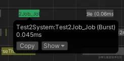 可见打开Burst编译,Timeline上的Job消耗变为了绿色,消耗再次降低,从0.718ms降低到0.045ms。
