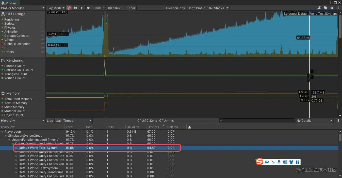 按照以往的调试经验直接看主线程性能消耗,会发现Test1System居然占了91.5%,从代码逻辑看显然是不合理的。这个时候需要打开Timeline看一下。