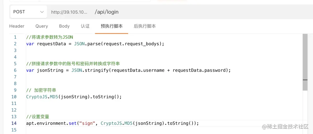 可以在Apipost中通过预执行脚本调用内置的JS库去实现预执行脚本是在发送请求之前自动执行的JavaScript代码