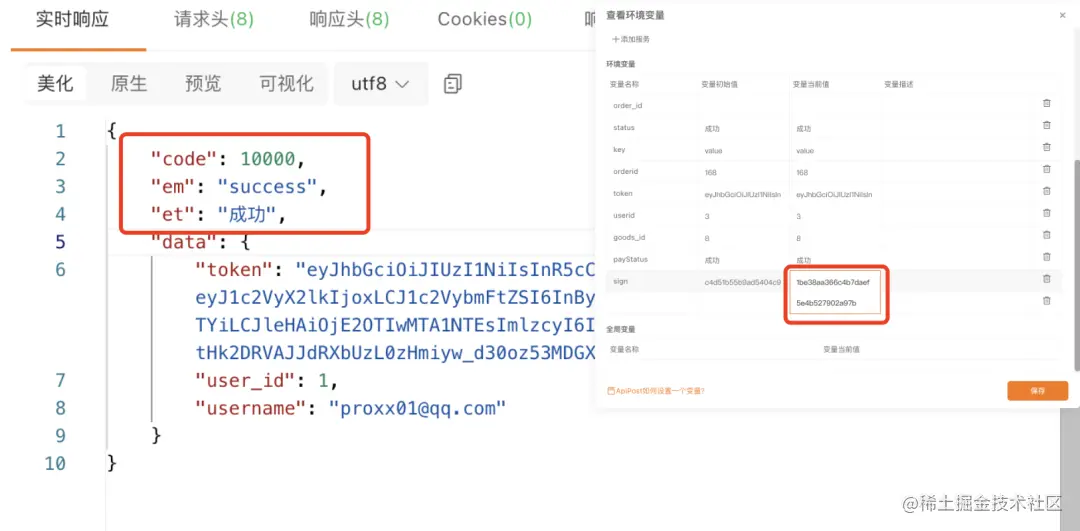 发送请求后响应成功且sign成功录入变量值