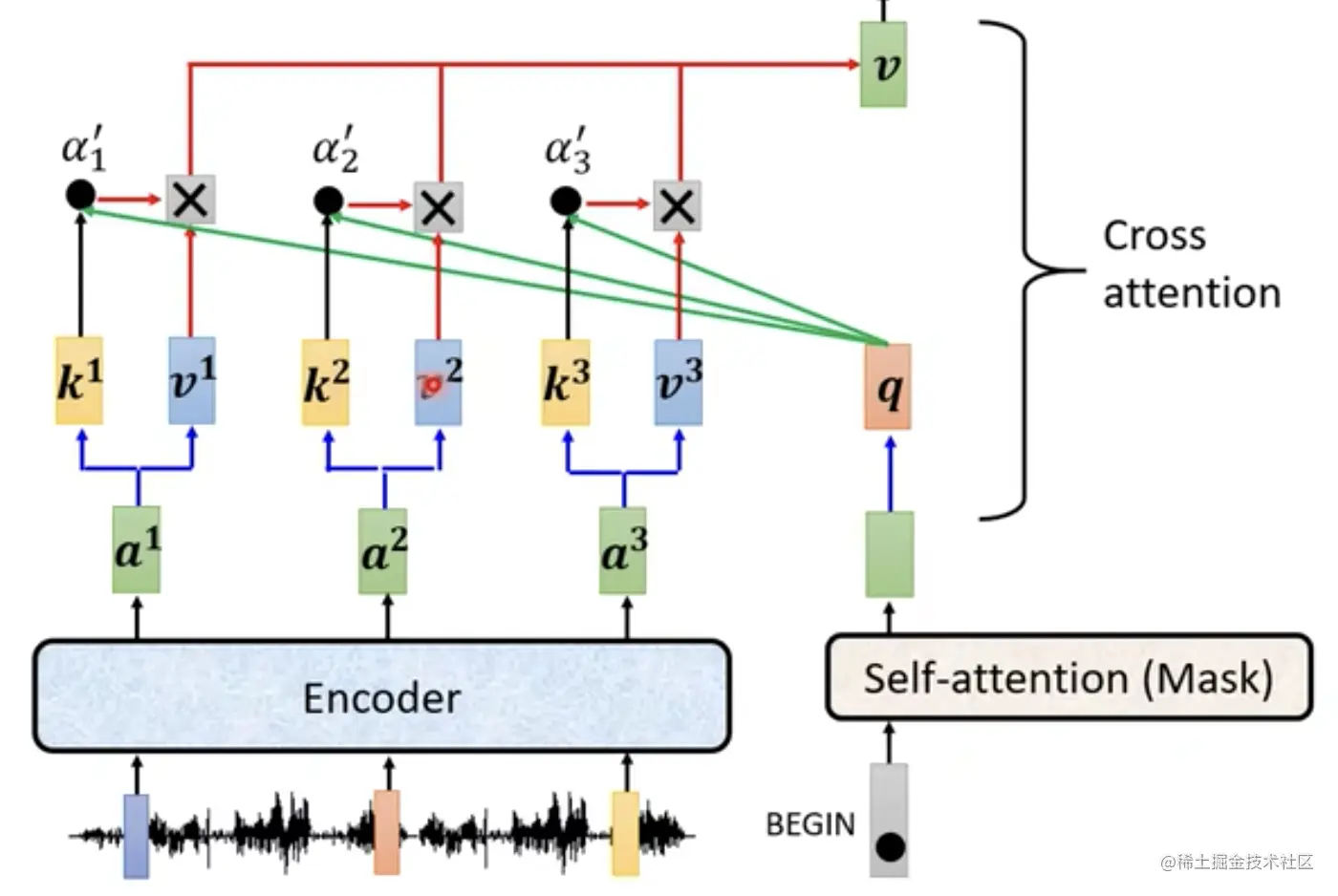 - 解码器Decoder提供的是q,就是一个query,比如是包含BEGIN特殊字符相关信息的
