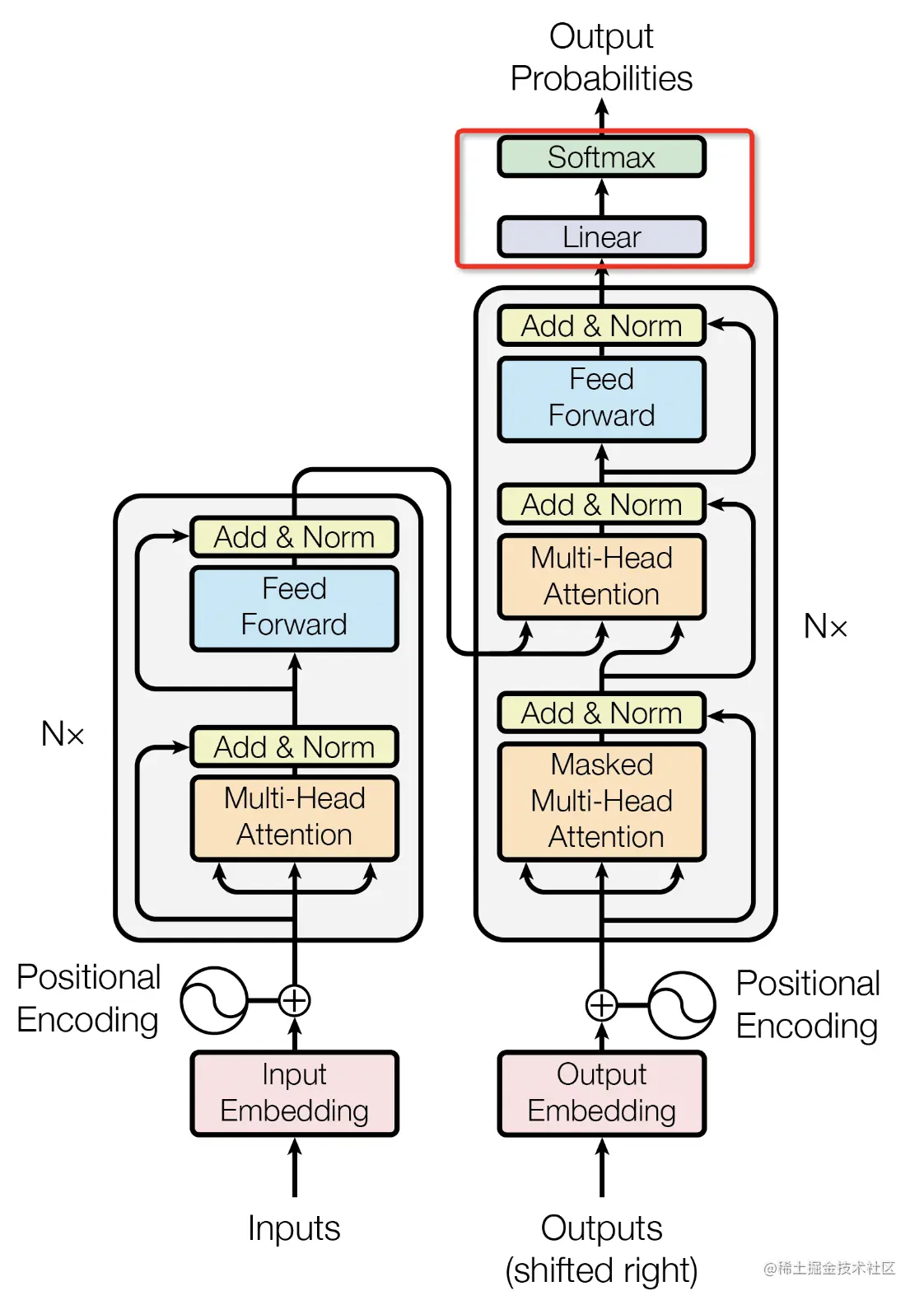 - 第二个多头注意力的输入部分其中1个来源于Masked Multi-Head Attention,其中2个来源于Encoder编码器,这里有个cross attention的概念。