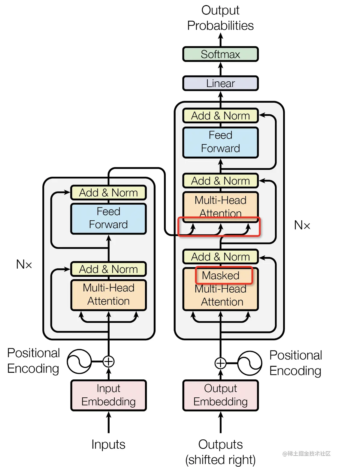 - 第一个注意力是遮掩后的多头注意力机制Masked Multi-Head Attention