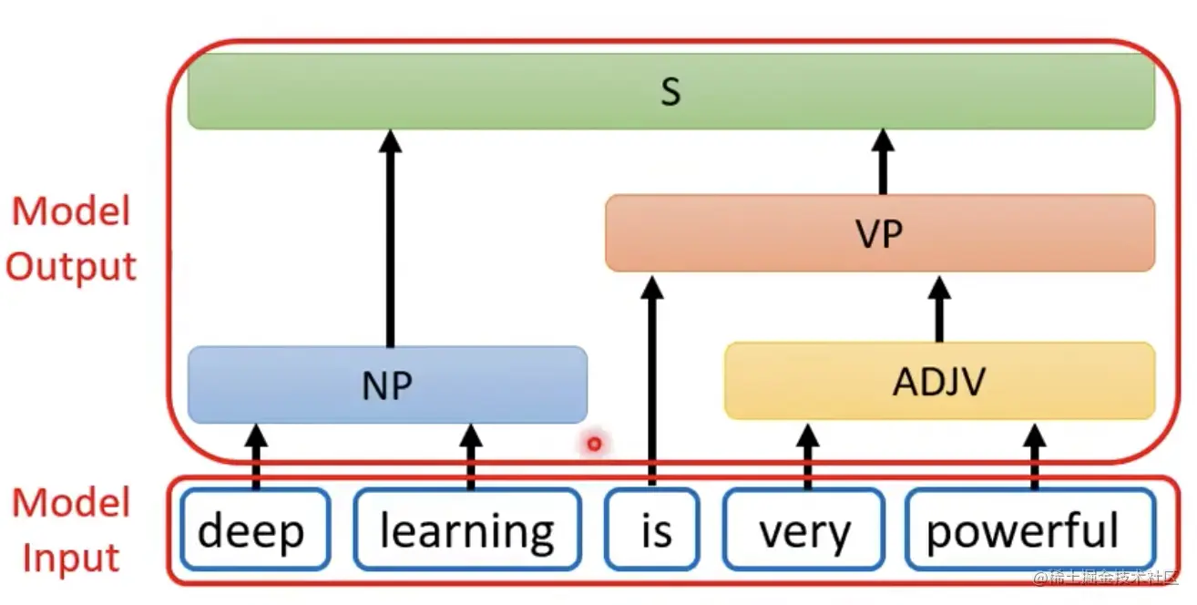 - 输出:长度为N,这段文本每个单词的词性说明(比如最基础的是名词n,动词v,形容词adj等等,实际标注中,比如图4中deep是NP,名词短语;is是VP,动词短语;)