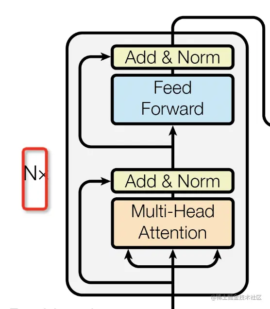 不过值得注意的是,Encoder会堆叠N次,论文中N取值为6(Decoder也是堆叠6次),如图31所示。