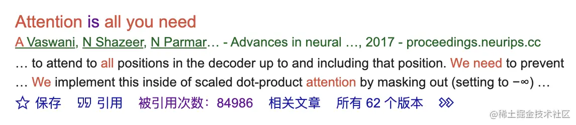 Transformer模型来源于2017年NIPS(CCF-A)谷歌团队发表的论文《Attention Is All You Need》。目前最火的大模型,比如BERT、GPT系列等都离不开Transformer模型。目前改论文的谷歌学术的被引用次数已经达到84986,如图1所示,这个数据已经可以载入史册了!