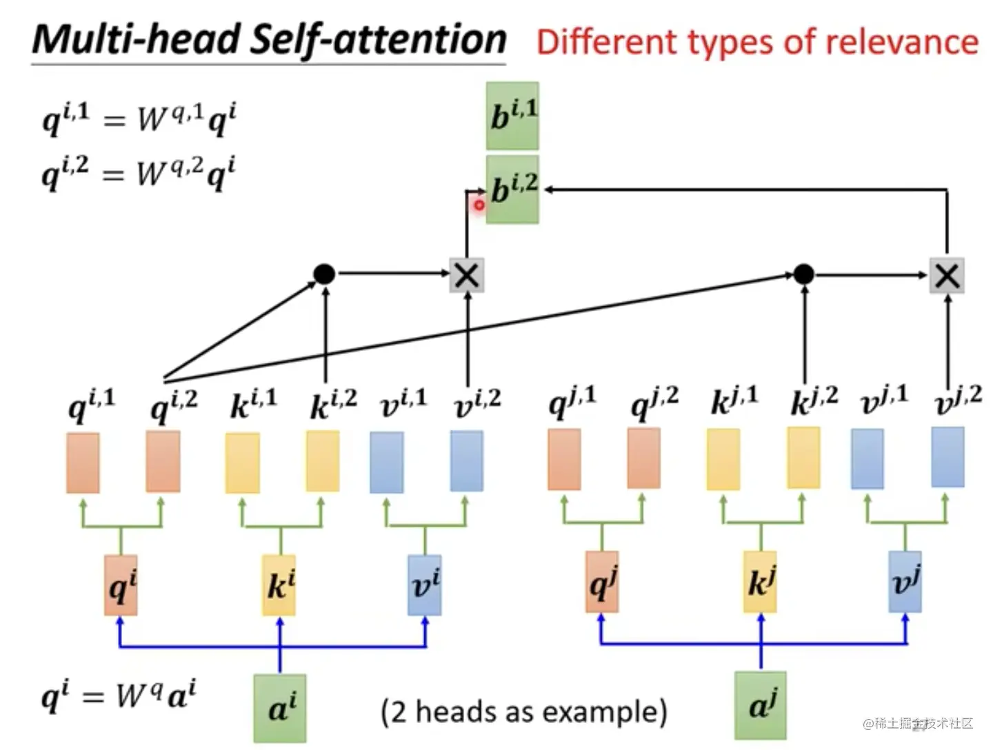 同样的,举个例子,我们假设有2个head的情况,输入仍然是两个单词编码,这里假设为[a1,a2],然后经过和共享参数相乘得到Q、K、V,经过head 划分以及计算注意力,最终得到值[b1,b2]