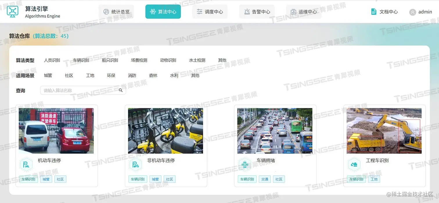 安防监控视频分析平台EasyCVR与AI算法中台结合使用,可以基于丰富的AI算法模型,实现对监控场景的智能识别分析,包括人脸检测/识别、车辆结构化数据、机动车/非机动车识别、行为识别(抽烟/打电话/玩手机/摔倒等)、睡岗离岗、劳保装备穿戴检测,以及城管场景识别算法、消防场景算法、水利场景算法、工地场景算法、社区场景算法等。感兴趣的用户可以前往演示平台进行体验或部署测试。