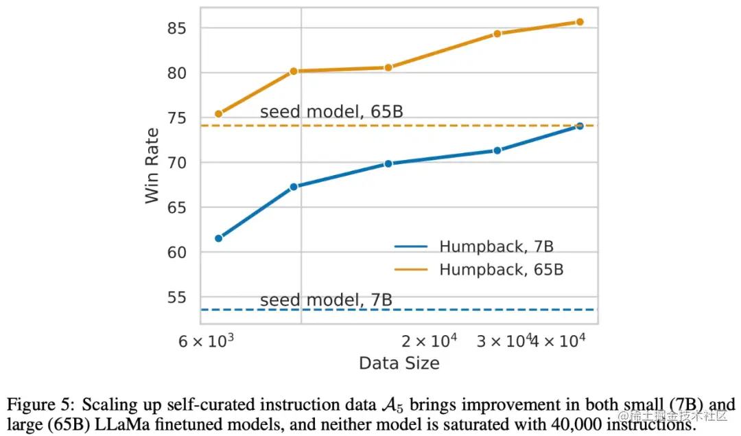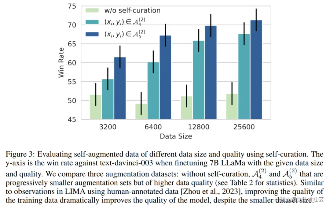 图 3 表示尽管扩大了数据规模,但没有自我管理(self-curation)的增强数据用来训练模型并不能提高指令跟随性能。