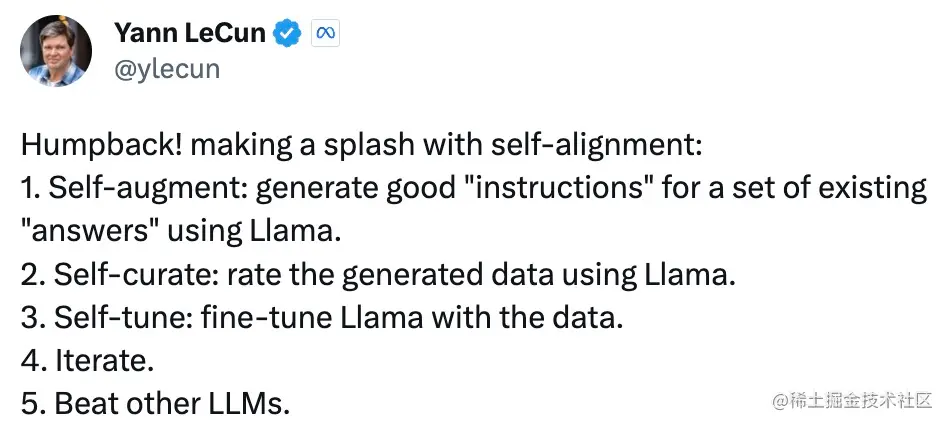 图灵奖得主 Yann LeCun 高度概括了这项研究的方法,并称赞 Meta 这项工作为对齐研究做出重要贡献: