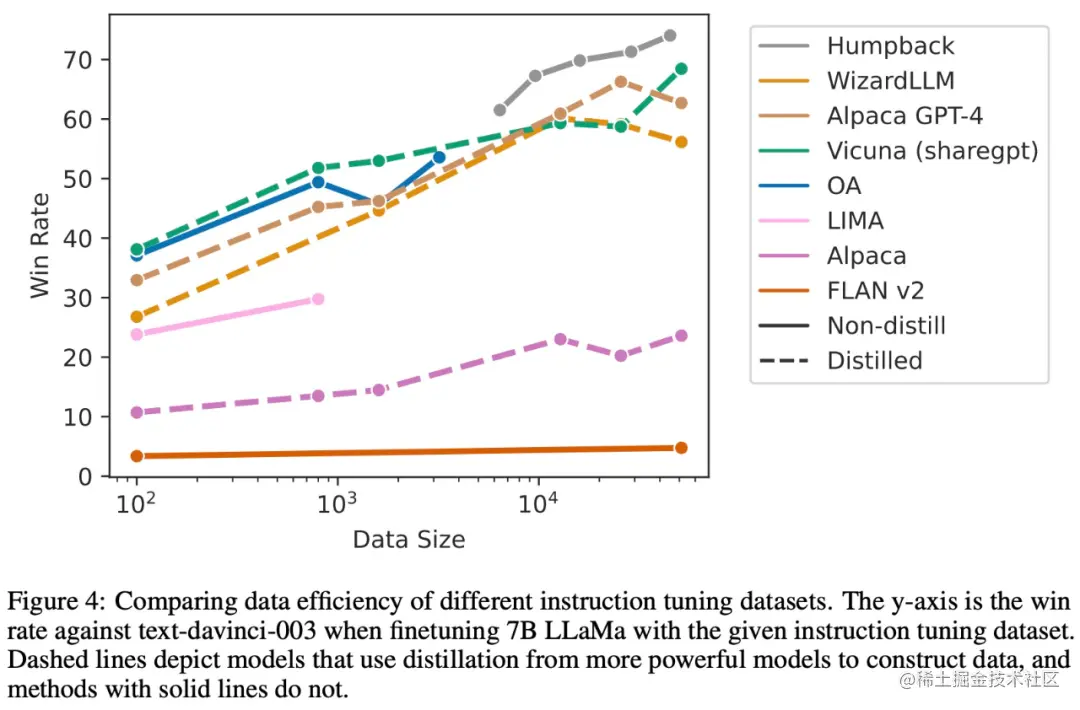 下图比较了不同指令调优数据集的数据效率。
