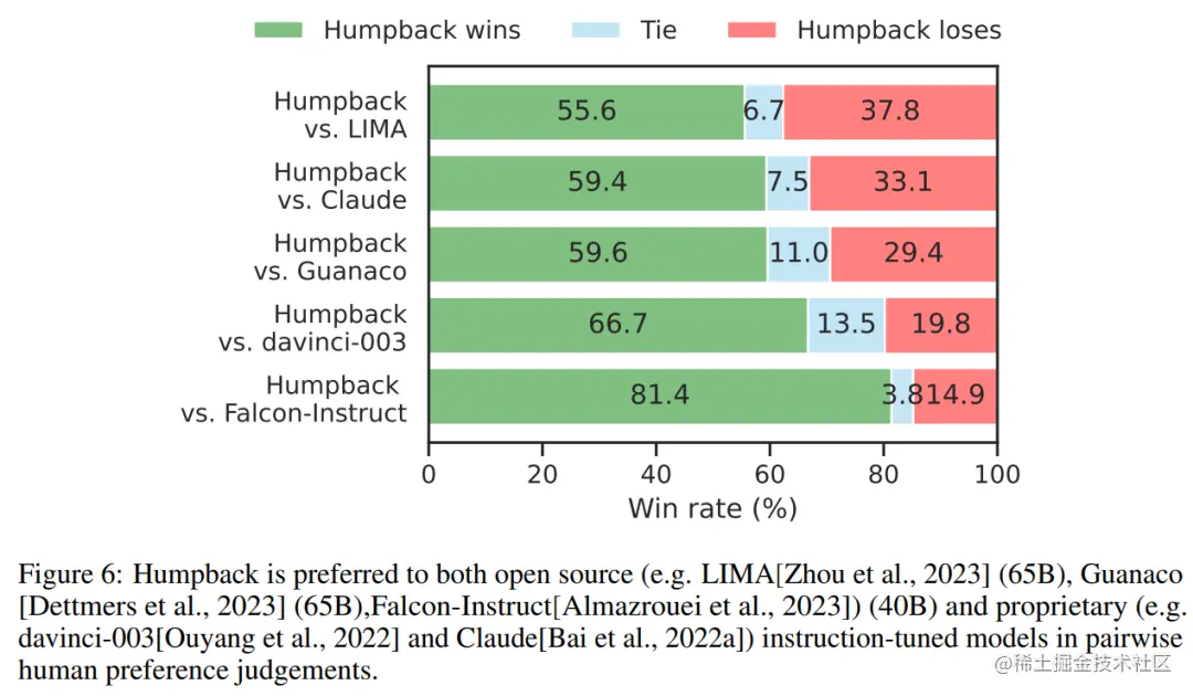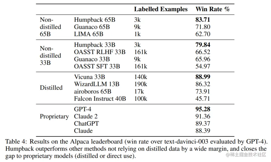 经过两轮迭代的数据集对 LLaMa 进行微调,所产生的模型 Humpback 在 Alpaca 排行榜上优于其他现有的非蒸馏模型,如 LIMA、Claude、Guanaco 等。