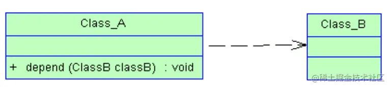 在UML类图中,依赖关系使用带箭头的虚线来表示,箭头从使用类指向被依赖的类。