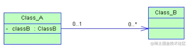 在UML类图中,双向的关联用带两个箭头或者没有箭头的实线来表示,单向的关联用带一个箭头的实线来表示,箭头从使用类指向被关联的类。