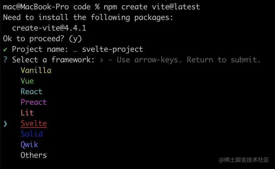 现阶段Vite创建脚手架已经集成了Svelte,所以我们可以使用Vite去初始化一个Svelte的开发项目~我们使用命令去初始: