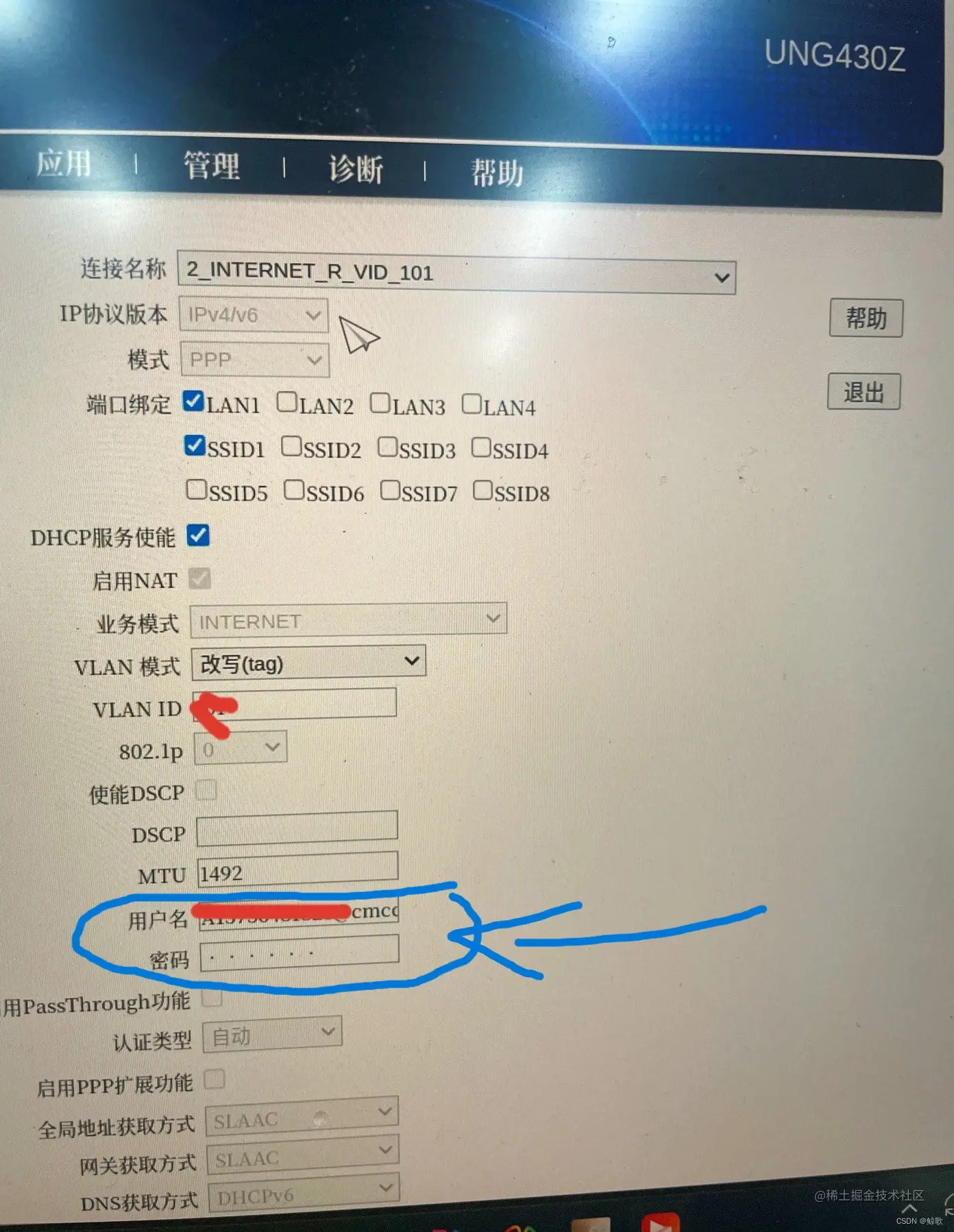 - 要提前知道自己的拨号账号和密码,如下图蓝色圈着的部分,光猫的连接名称为INTERNET字样下的配置里面有拨号的账号,密码无法查看(F12大法可以),不过密码没有修改过的都是手机号后六位,不对打人工客服,他会给你发一个重置密码的短信。