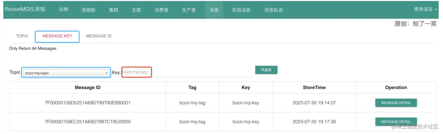 编写一个生产者接口类,分别使用RocketMQTemplate和DefaultMQProducer实现消息发送的功能,然后可以通过Dashboard控制面板查看消息详情;