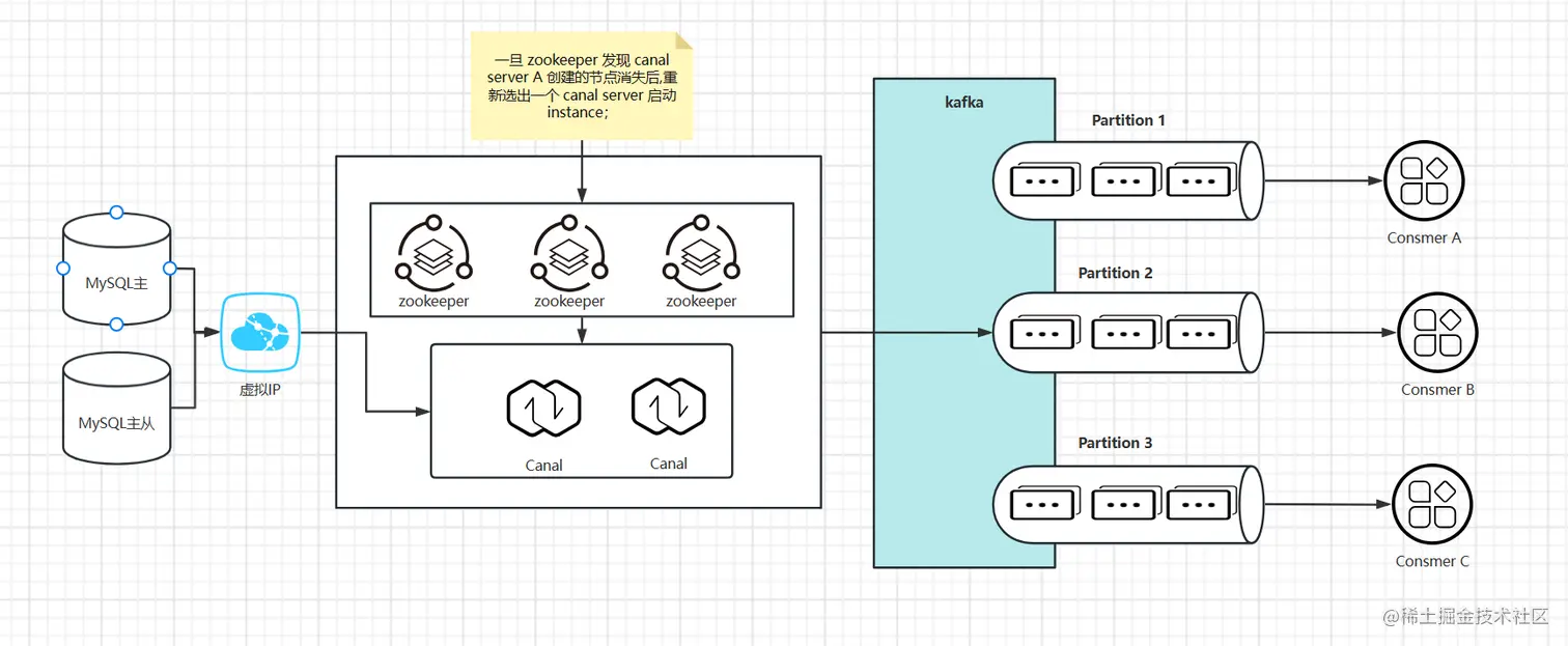 - Canal 根据一定的逻辑进行分发到多个 Partition,多消费者进行消费,提升消费速度