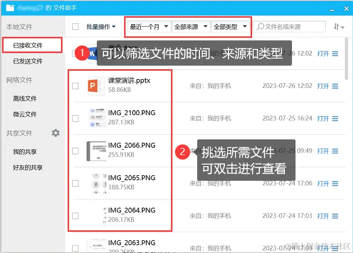 步骤2:在文件助手页面,可以通过文件类型、来源、时间来进行精准筛选,双击可以预览文件,确认无误后右键【转发】给【我的iPhone 】就可以重新接收文件了。