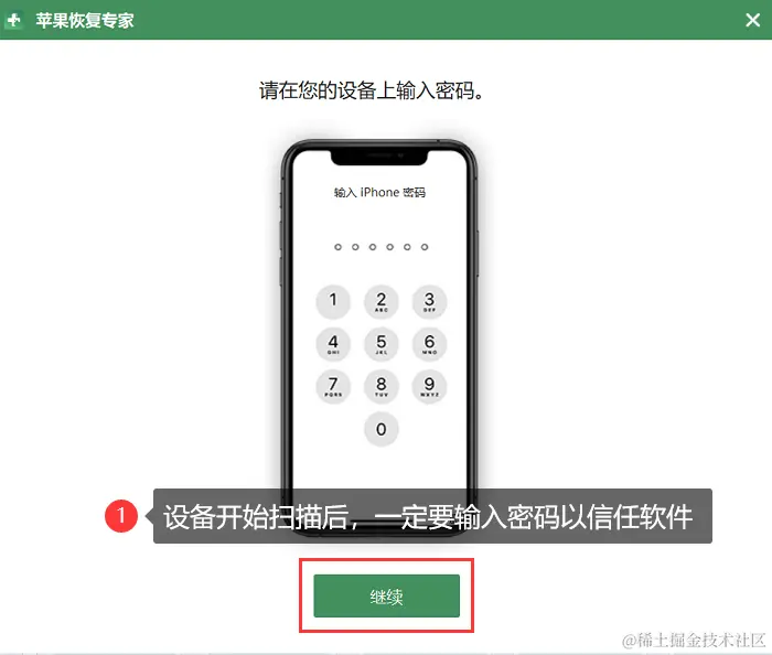 步骤2:默认【从iOS设备中恢复】,连接成功后,点击【开始扫描】,然后会弹出【输入密码弹窗】,输入密码受信任于软件即可。